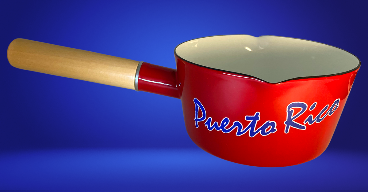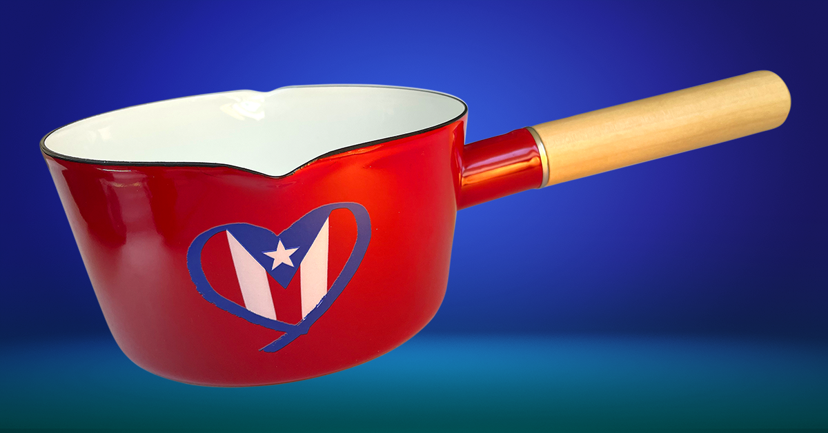 Preciosa y práctrica caserola souvenir de 1.2 litros, en acero con enamel y mango de madera. Diseño original de Inspire Prints de corazón con bandera de Puerto Rico. Ideal para regalar, especialmente a familiares y amigos en el extranjero.